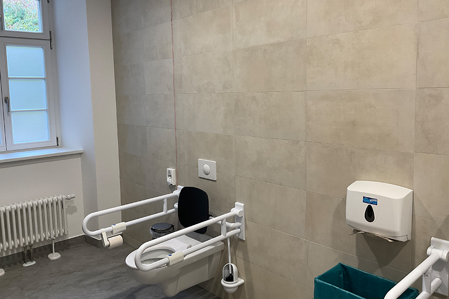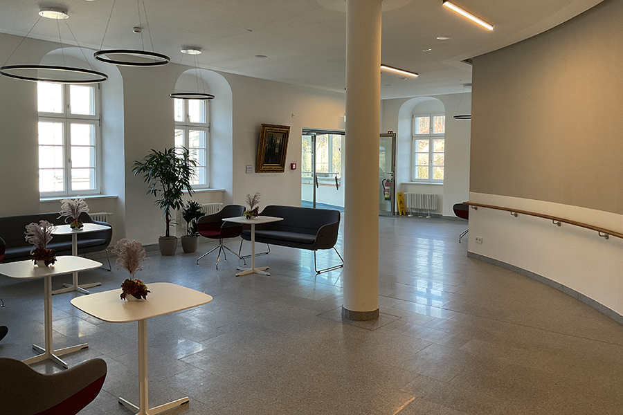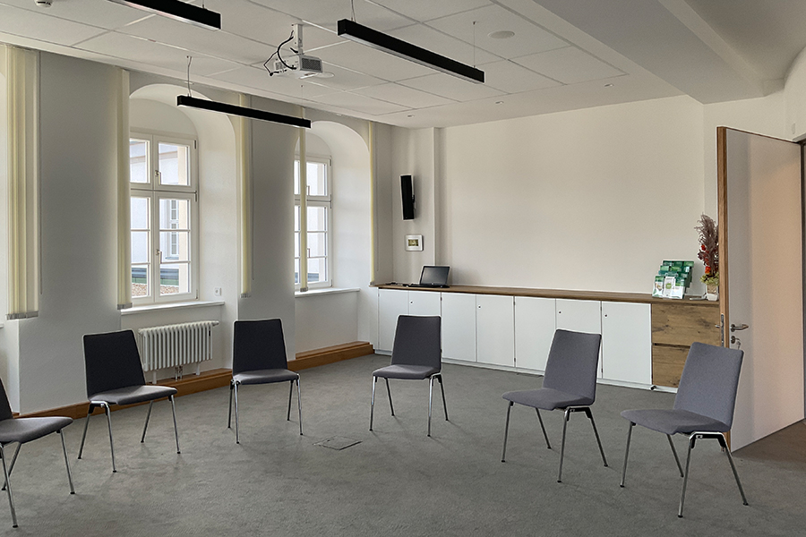 Durch die Außerbetriebnahme der seit Jahren stark rückläufig genutzten Kegelbahn bestand die Möglichkeit einen modernen Mehrzwecktherapiebereich mit Gangschule, Ergotherapie und Tele-Reha-Nachsorge zu integrieren. Außerdem wurde die Caféteria auf ihrer vorhandenen Fläche neu organisiert, indem sie einen modifizierten Kioskbereich erhielt und der Freizeitbereich integriert wurde. /